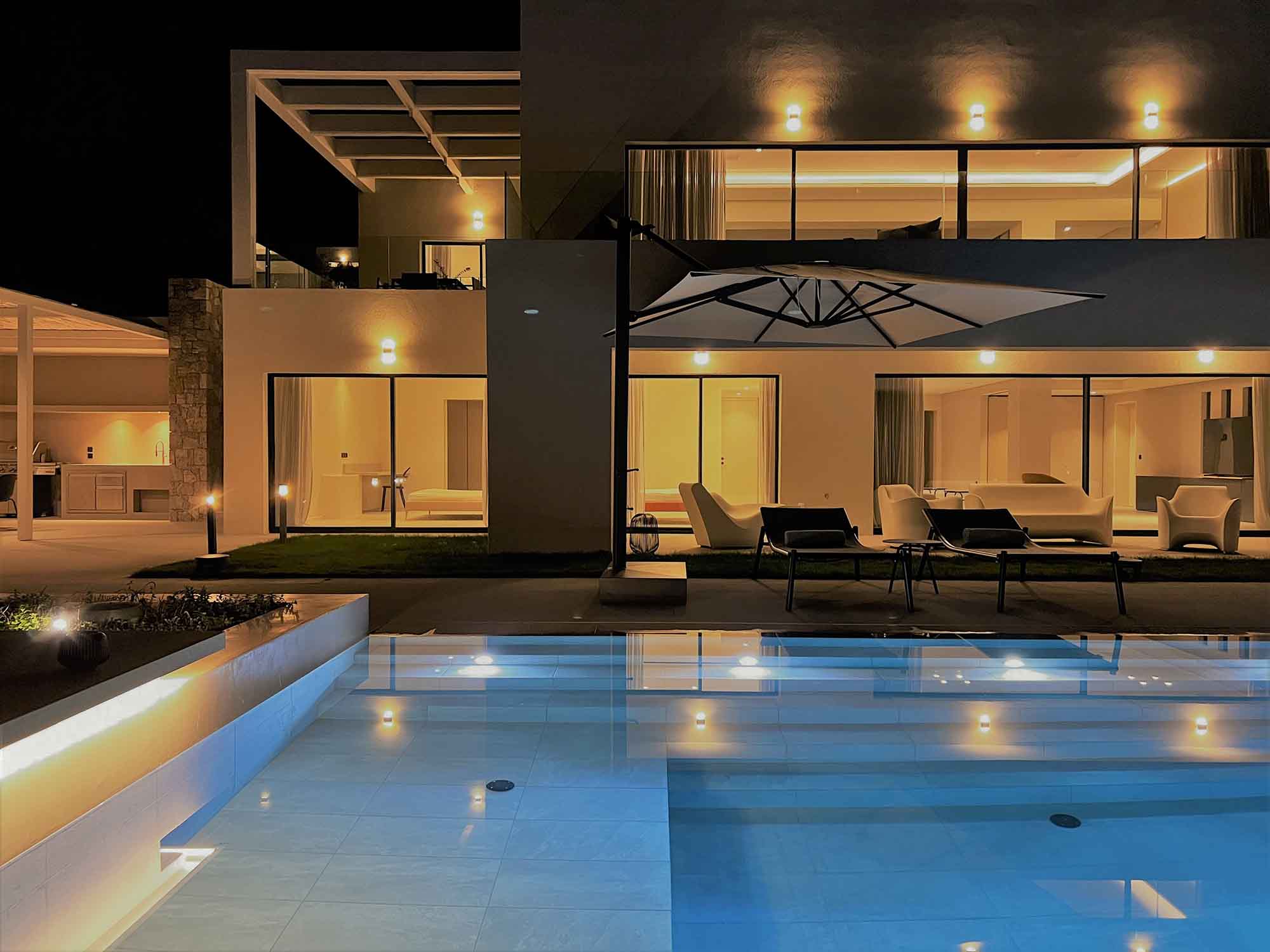 Villa Revival has just as much to offer in the outside areas of the villa. All eyes will be drawn to the pool area which boasts an 18 metre infinity pool and a swim up bar housing an outdoor fridge and ice machine. The pool is bordered with sunbeds, large umbrellas, a luscious lawn, lounge and sunken seating areas which are all served by the Sonos sound system. Outdoor dining for 14 can be enjoyed in the shade of the pergola and prepared on the Napoleon gas barbecue. Evenings on the roof terrace are an event in themselves as the sun sets across the Aegean, giving way to a truly magnificent array of stars which can be savoured from either the lounge area or six person hot tub.