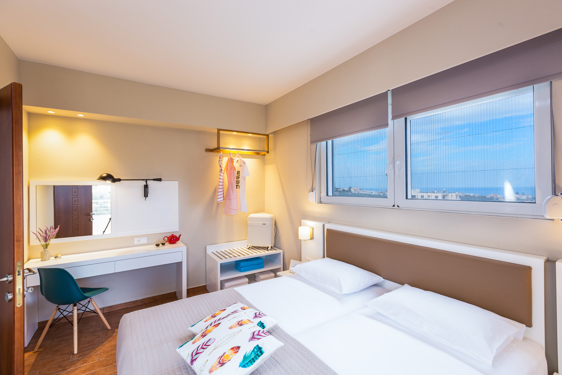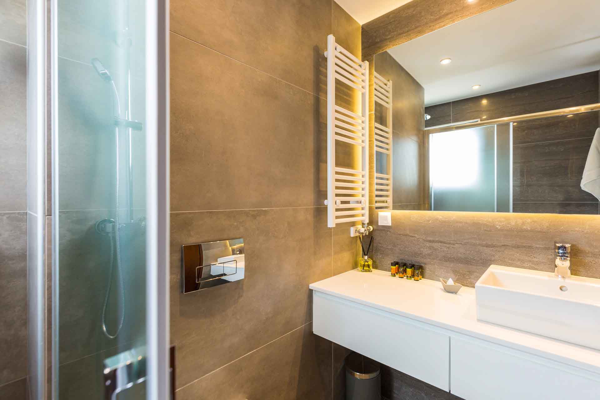 - Bedroom 2: Double size bed (1.60x2.00), desk, ensuite bathroom with shower, balcony