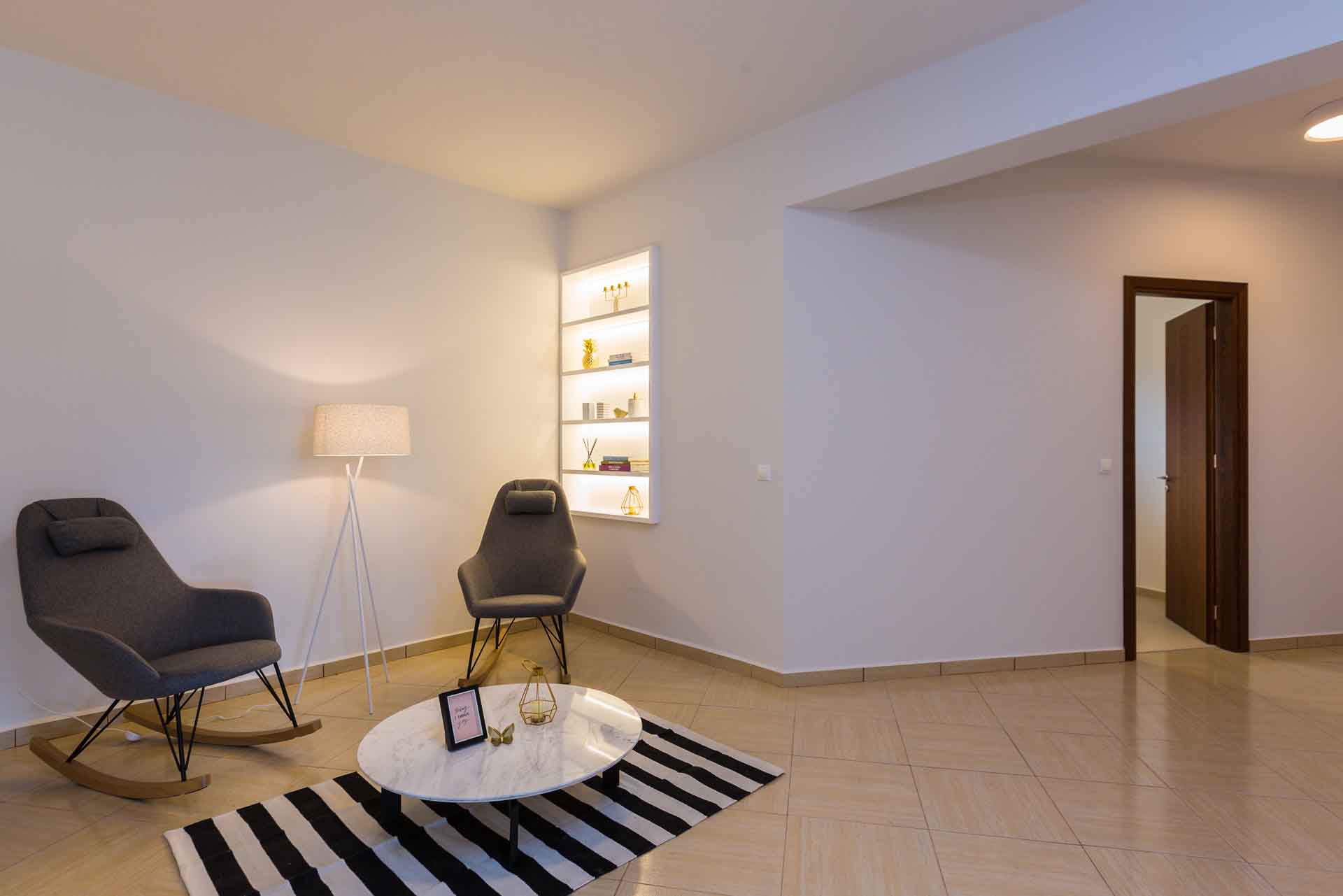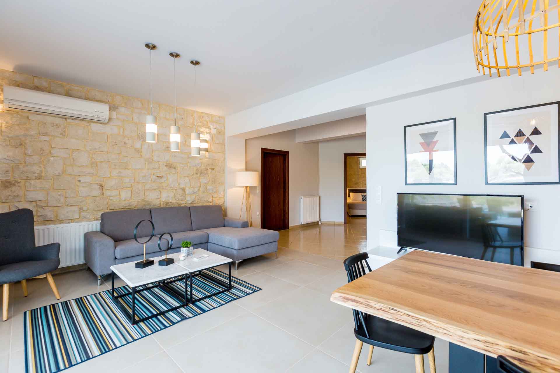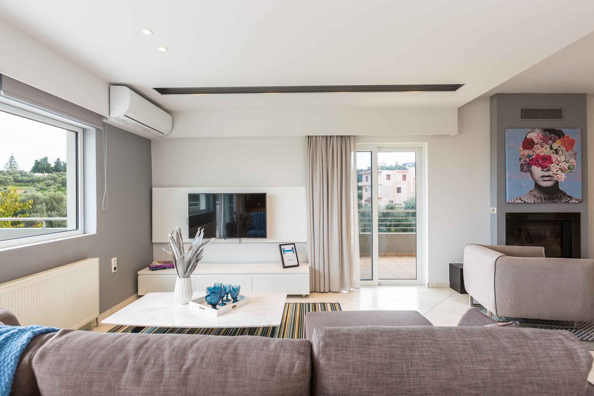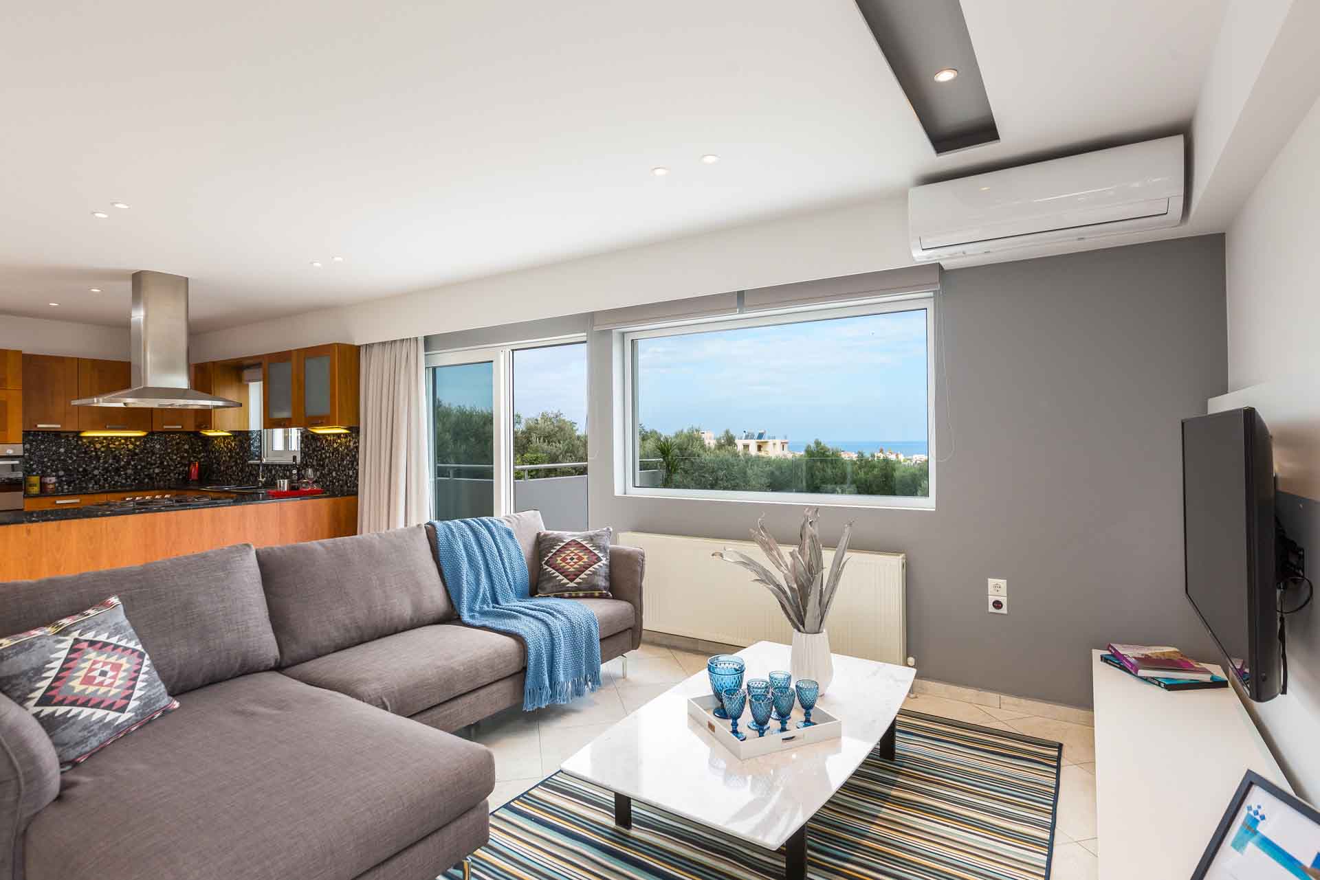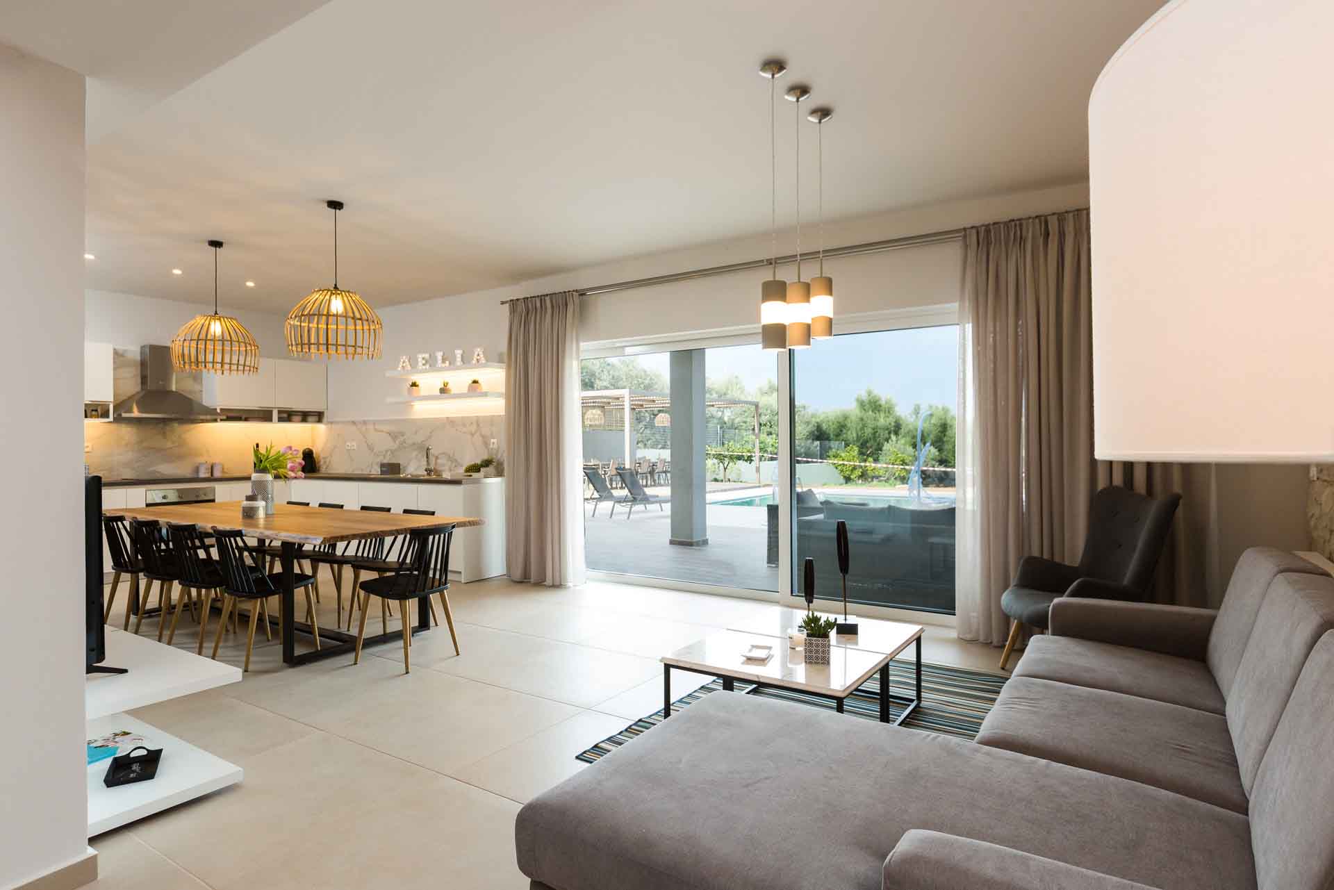 - Living area with sofa, access to the pool terrace