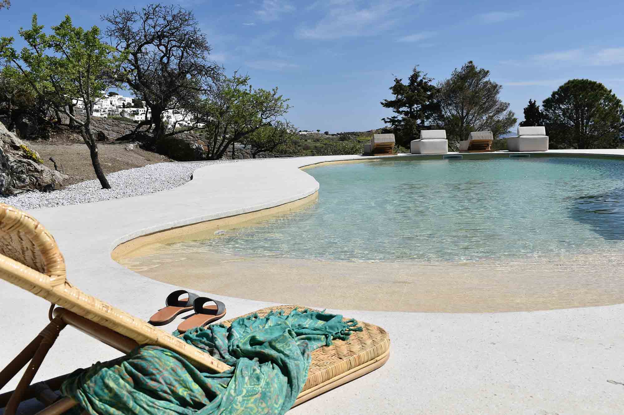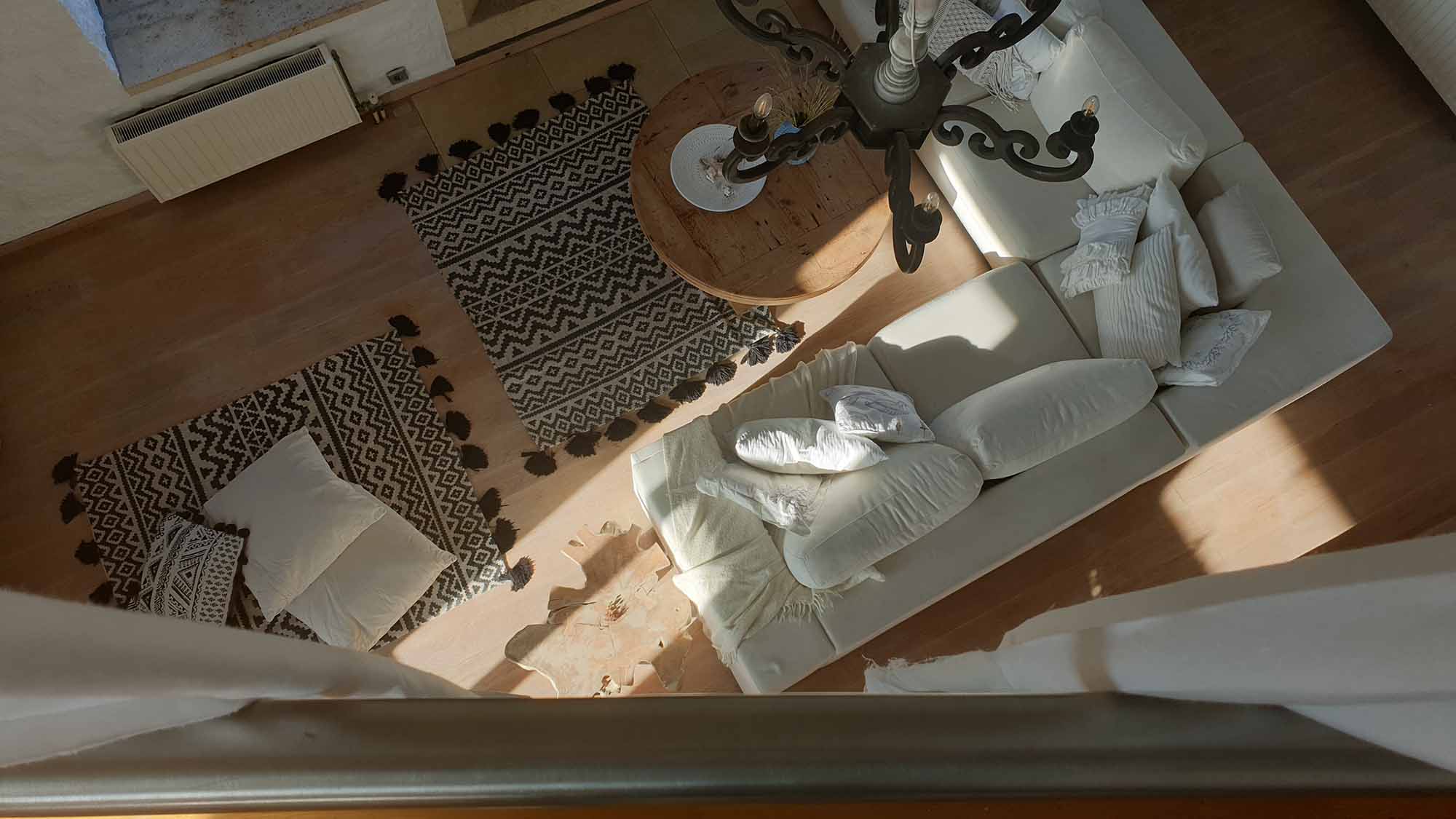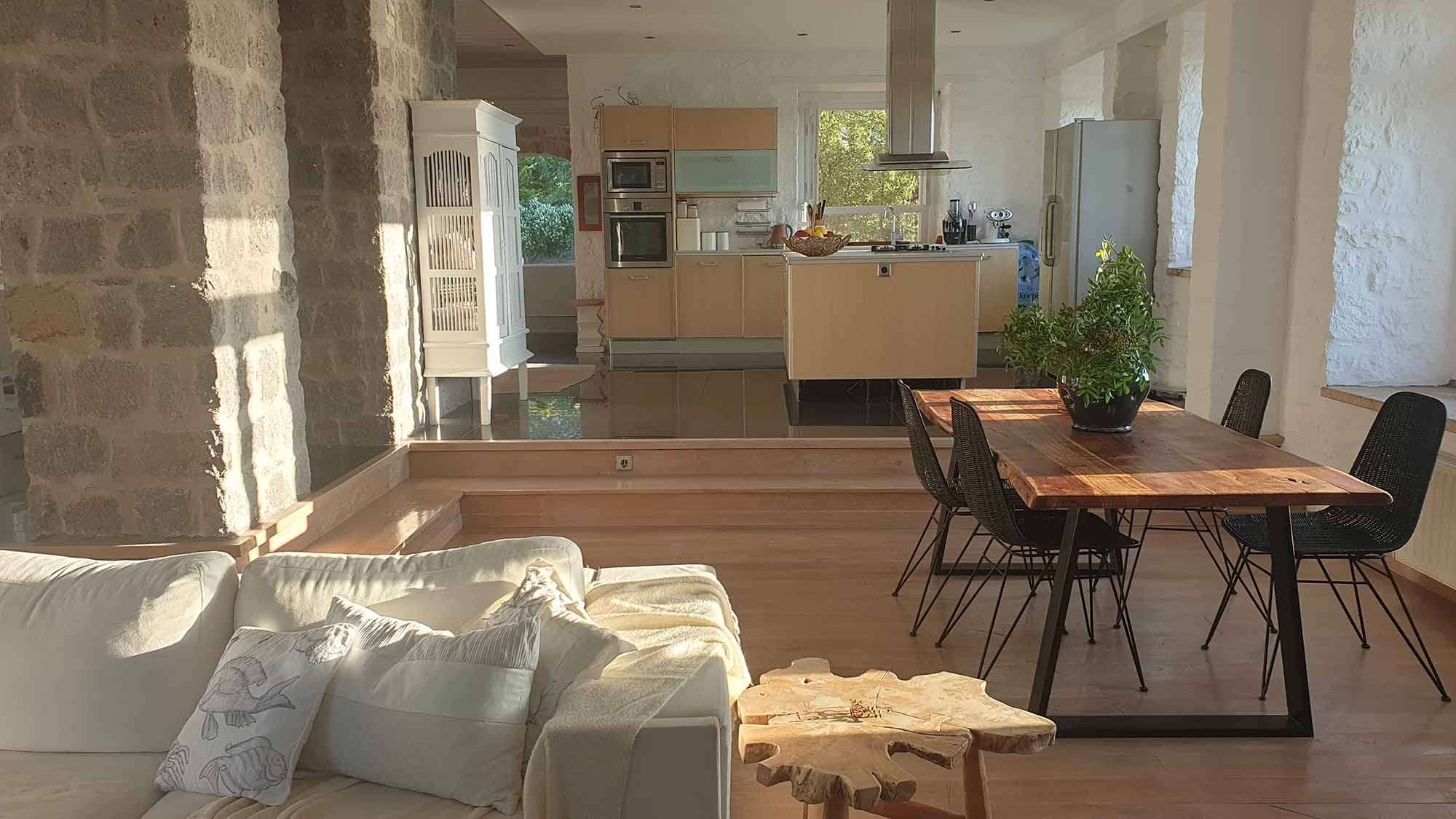 The interior of the house combines local ethnic style with modern lines while space and amenities offer a cozy and bohemian aura. There are four bedrooms, two with double beds and two with two single beds each served by 3 bathrooms one with bathtub and two with shower (one of which with hydro-massage). Bath and sea towels, sleepers, ecological shampoo and bubble bath are provided. A washing machine, dryer, iron and iron board, hair driers are also available to clients. The villa has central heating and parking.