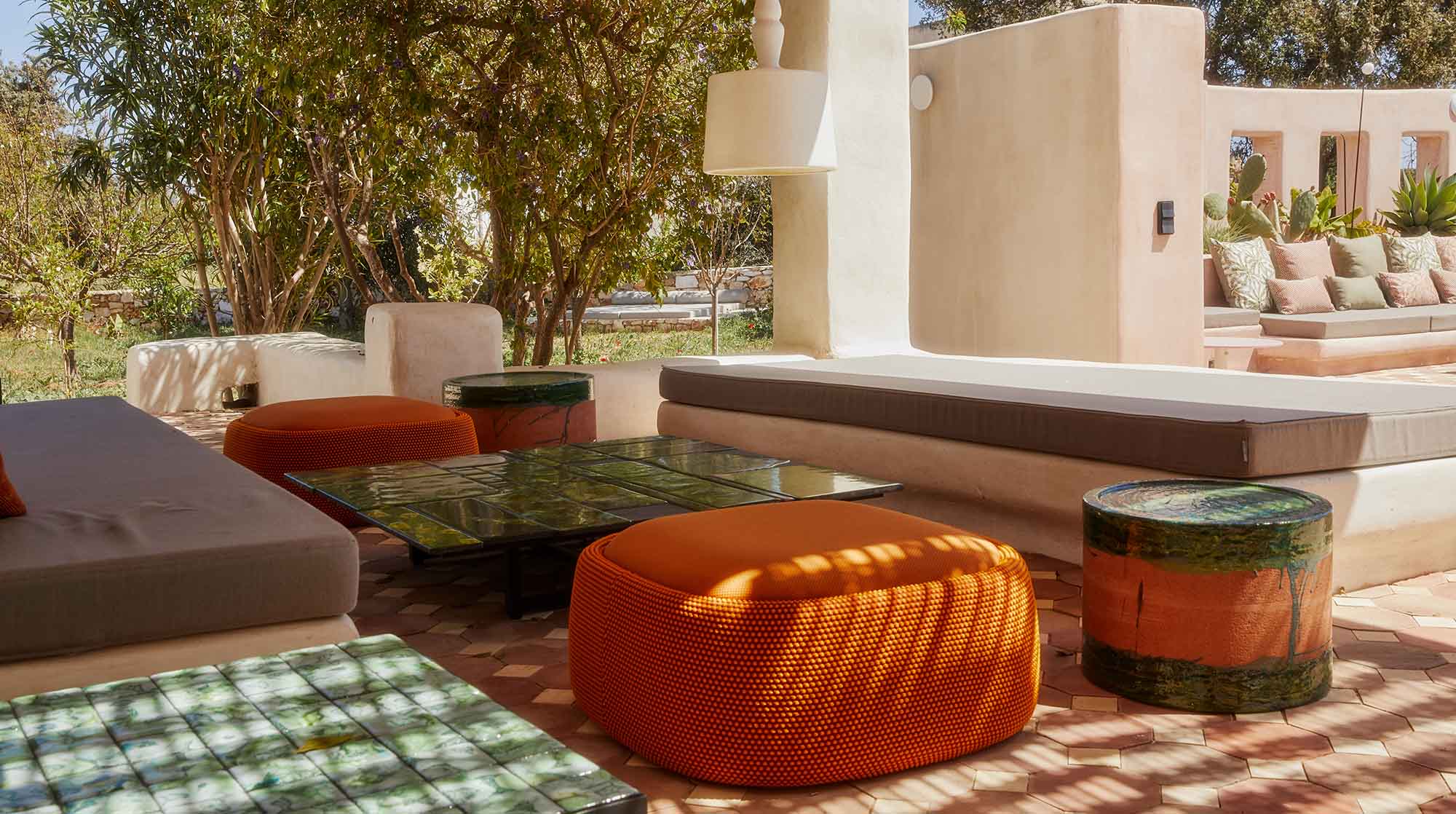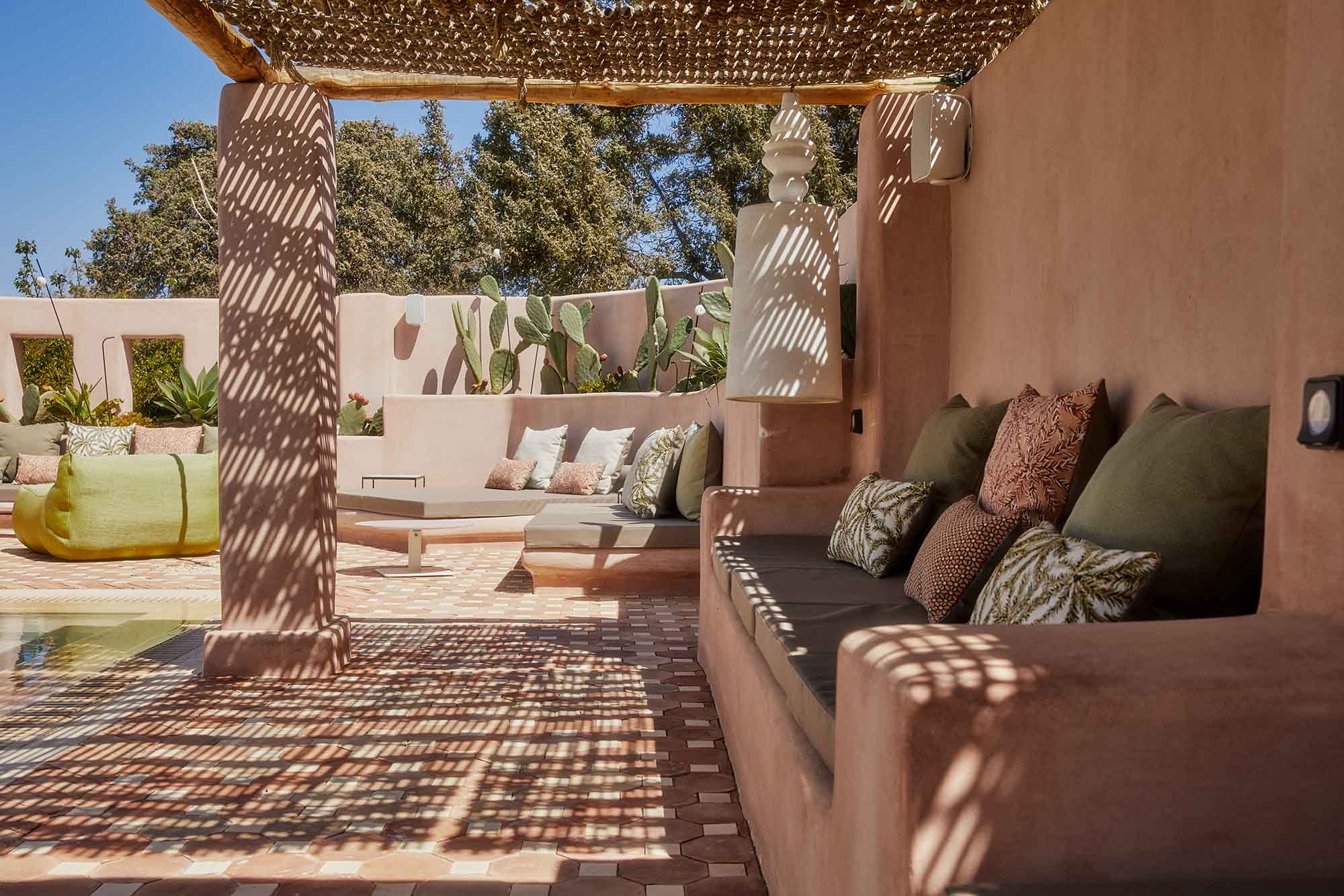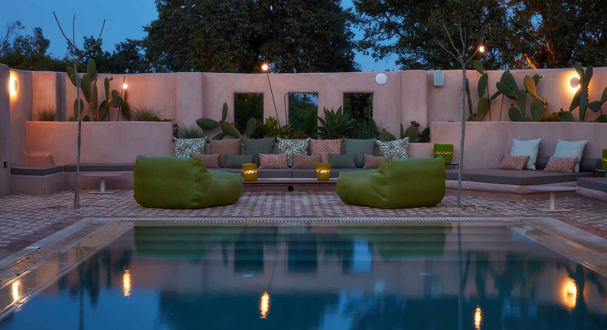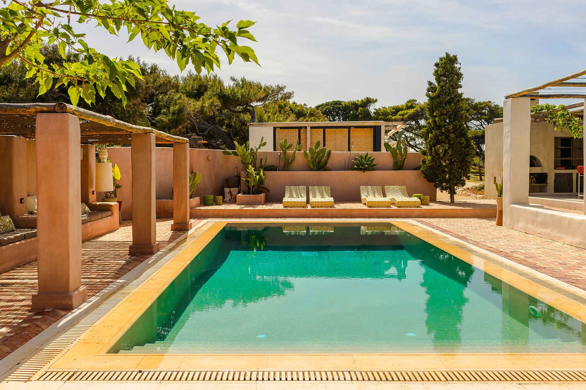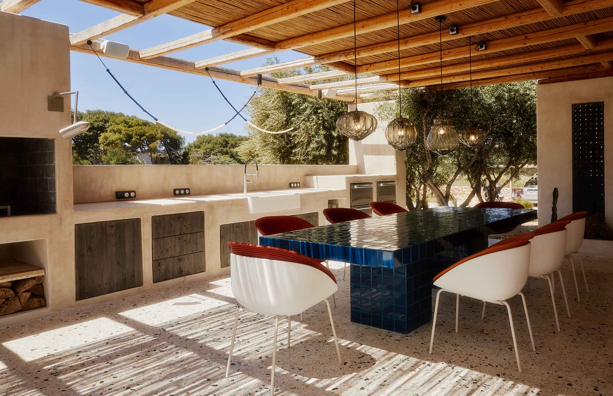 Stepping outside, guests are greeted by a tranquil oasis. The centerpiece of this peaceful space is a long pool surrounded by comfortable lounge chairs, sofas, lush greenery, and fragrant flowers. Nearby is a shaded area with an outdoor kitchen, featuring a barbecue and traditional oven, as well as a sprawling dining area that inspires unforgettable moments with friends and family.