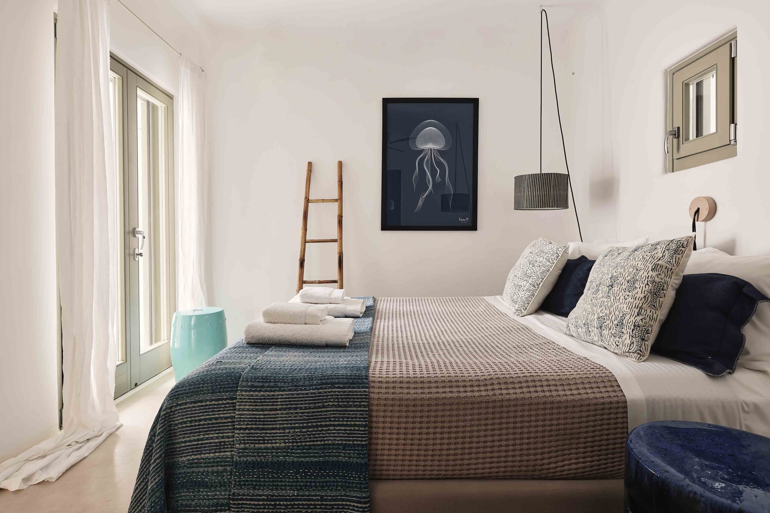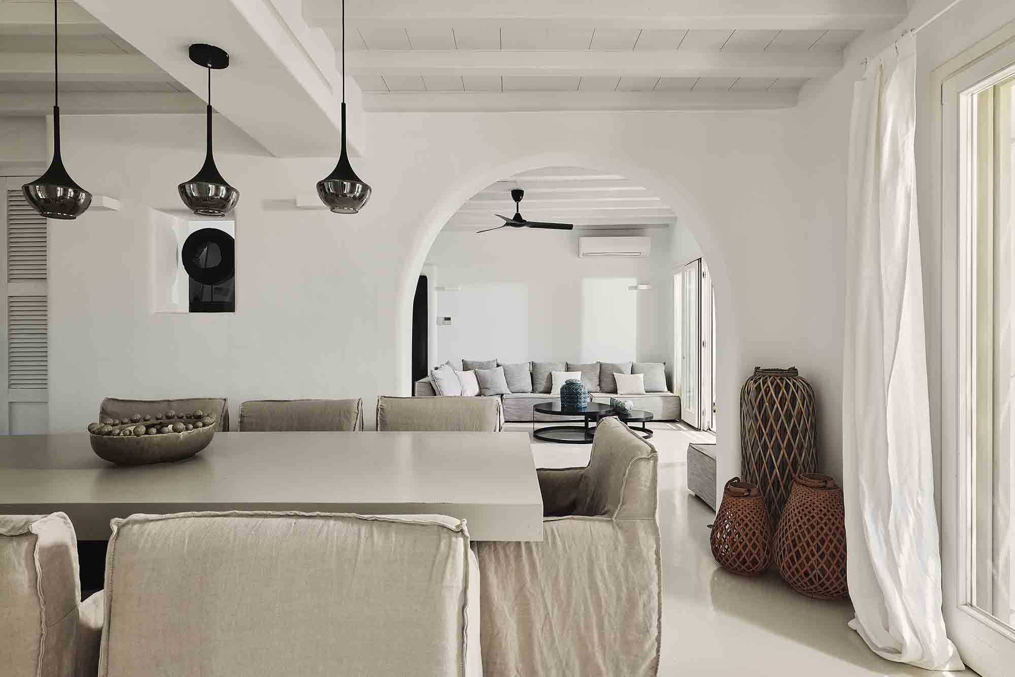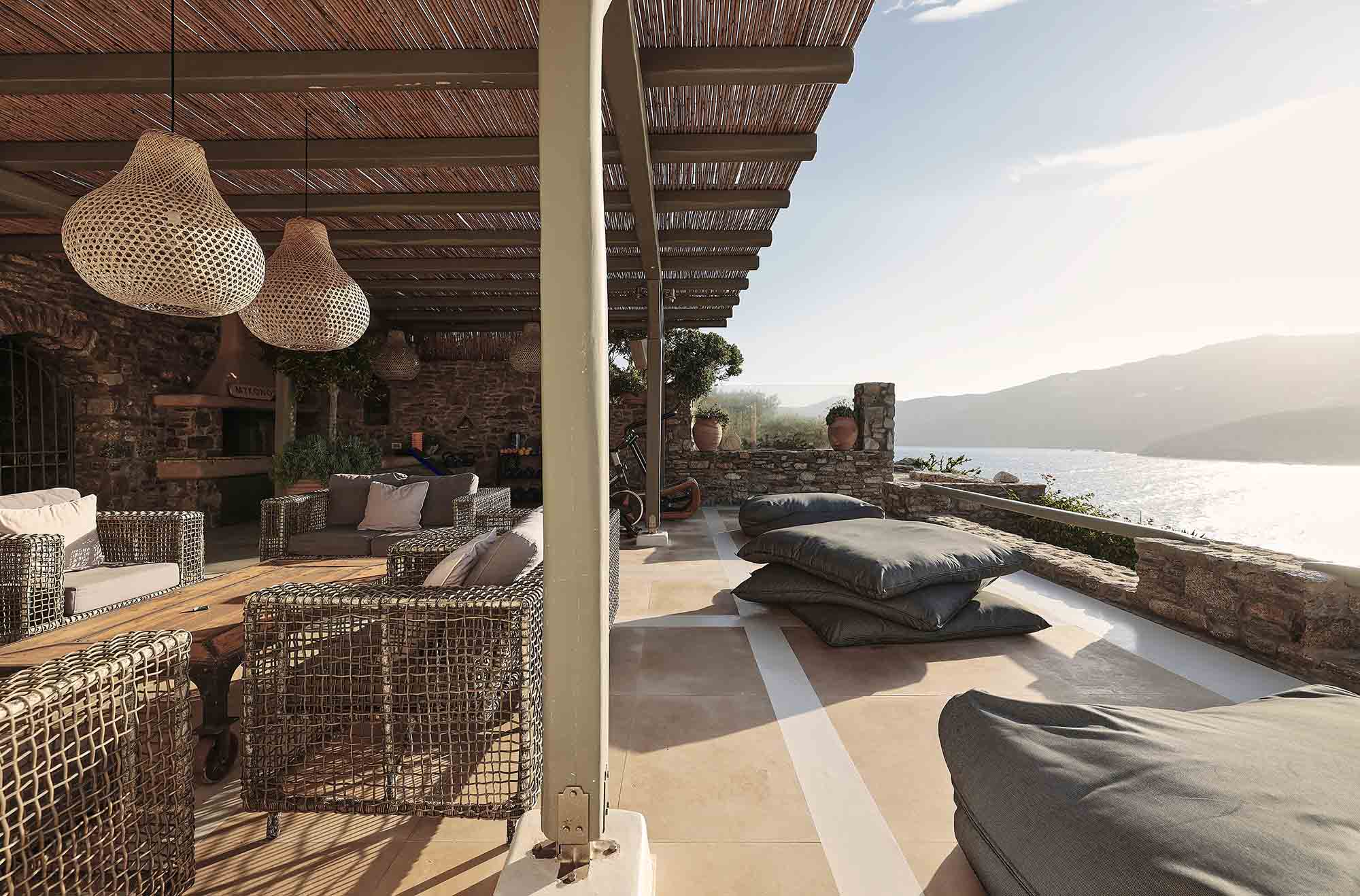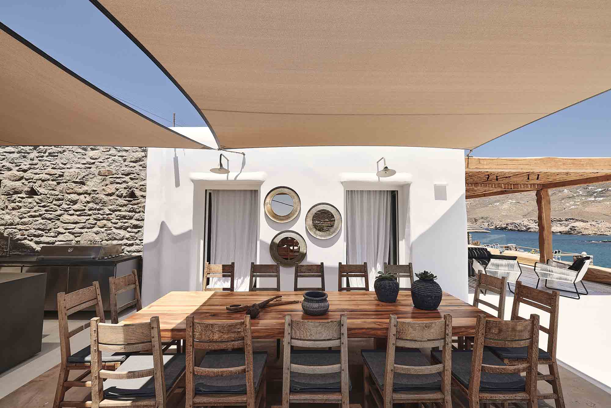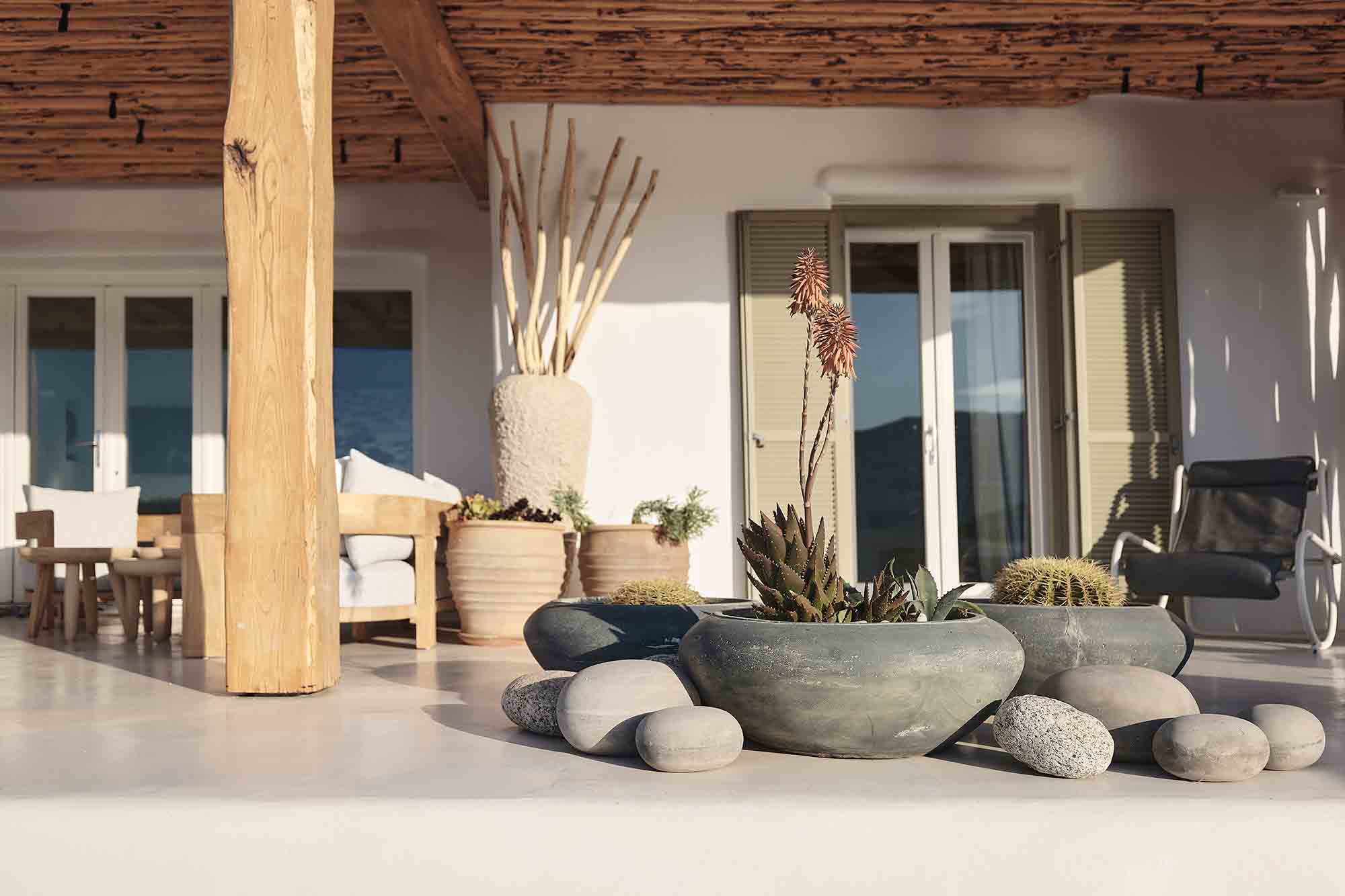 The pristine courtyard, terraces, and surrounding gardens offer a heaven of leisure and serenity, affording many charming spots in which to rest, read, dine, or entertain. Located only a few steps away from the beach, specifically 5 minutes’ walk through the private pathway, which connects villa Solana and Ftelia.