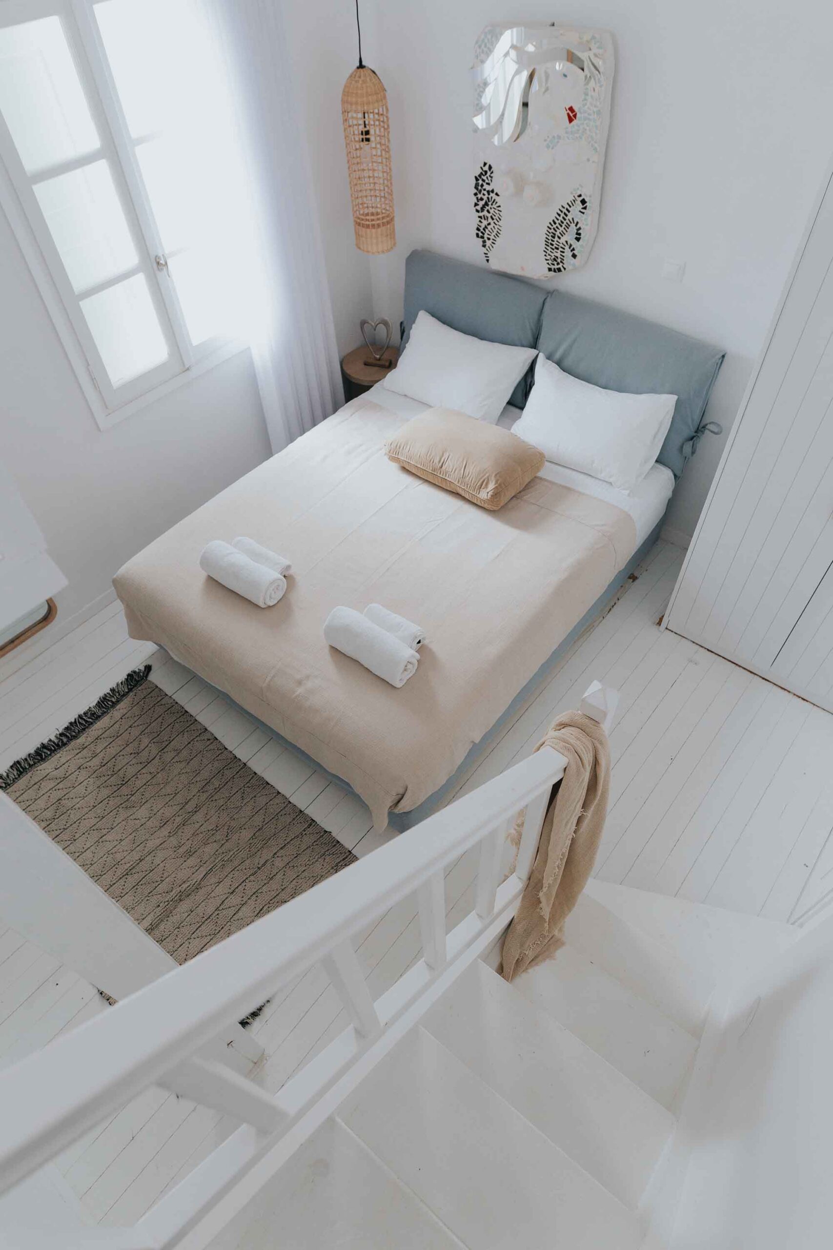 The second villa consists of the ground floor, which includes an open-plan living area with a dining area, a fully equipped kitchen, a cozy fireplace, and two bedrooms with queen-size beds. The first floor has a living and dining area with a fully equipped kitchen, one bedroom with a queen-size bed, and an outside mezzanine with another queen-size bed.