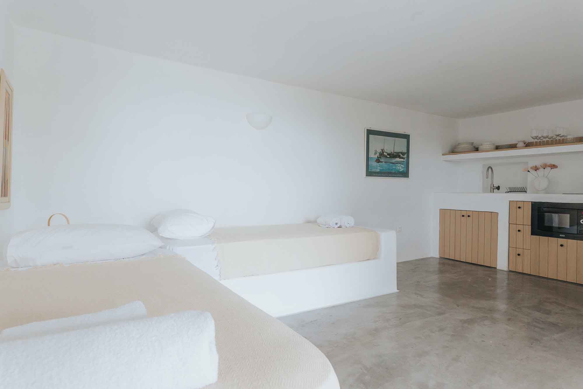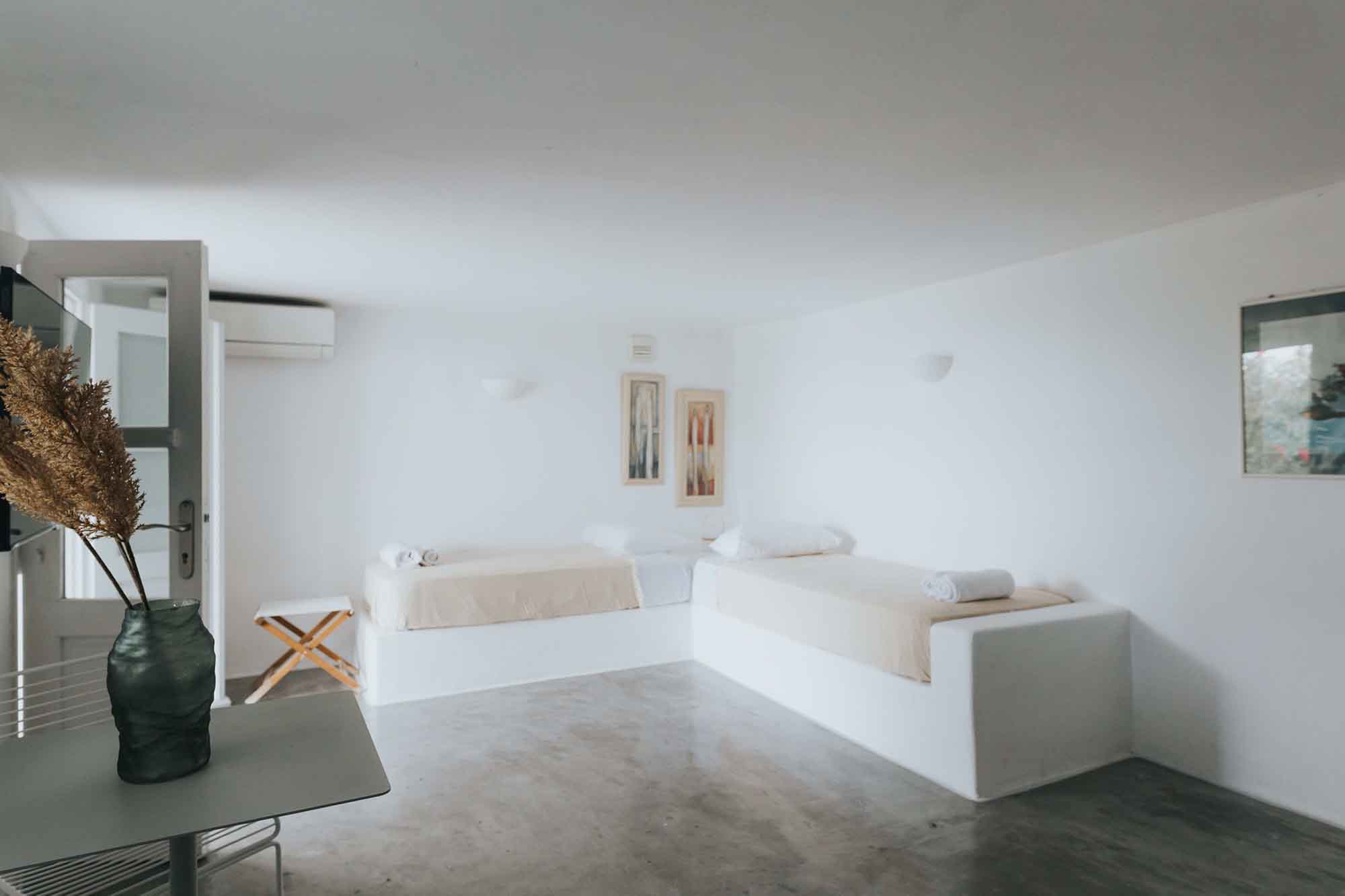 Villa Solar Four is a modern estate nestled in the heart of the Cyclades, right on the Platis Gialos Bay’s shoreline. The estate consists of three distinct buildings, each occupying its own plot of land, perched gracefully atop gentle hills that provide breathtaking vistas of sunset and the Aegean Sea.