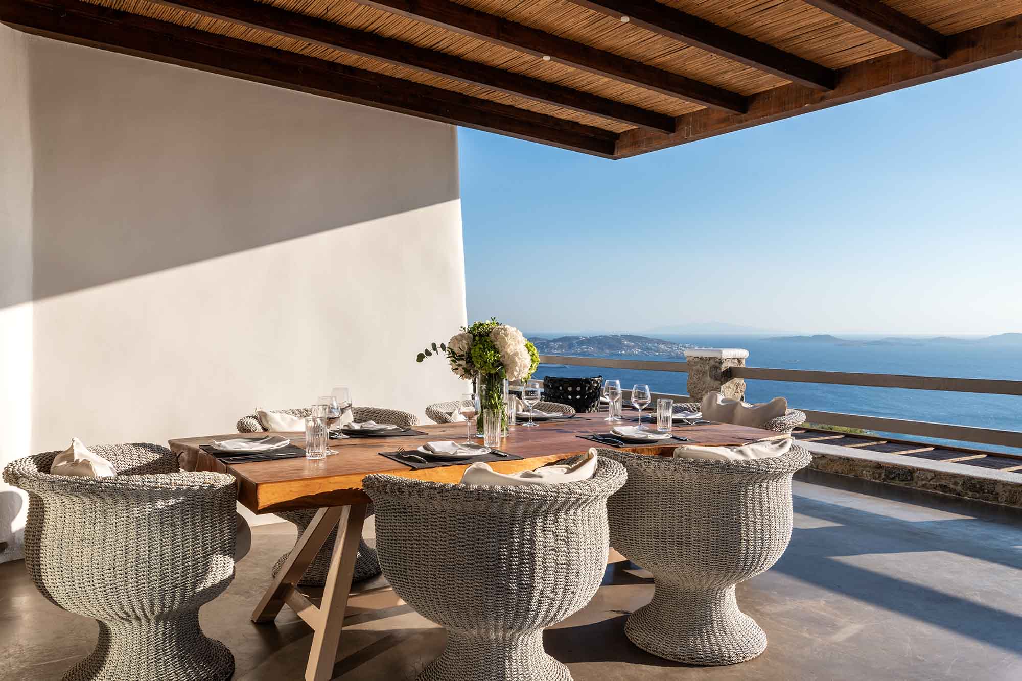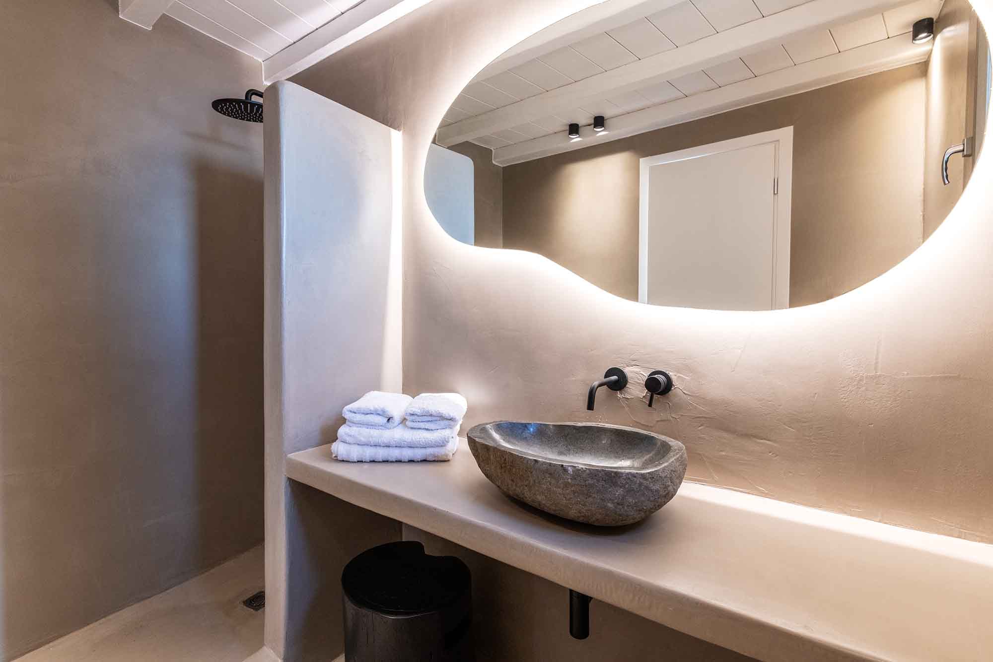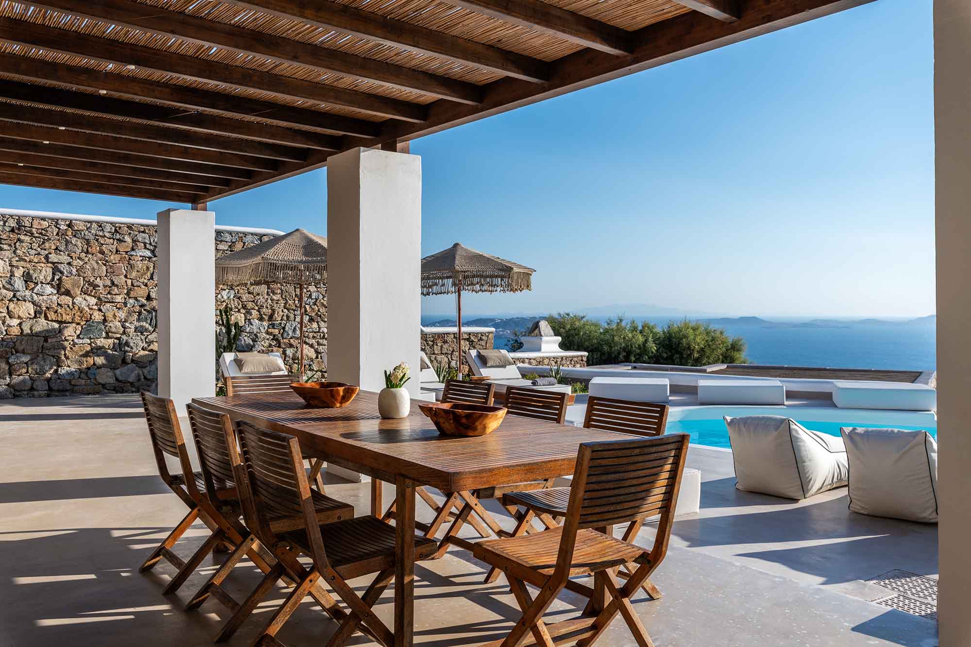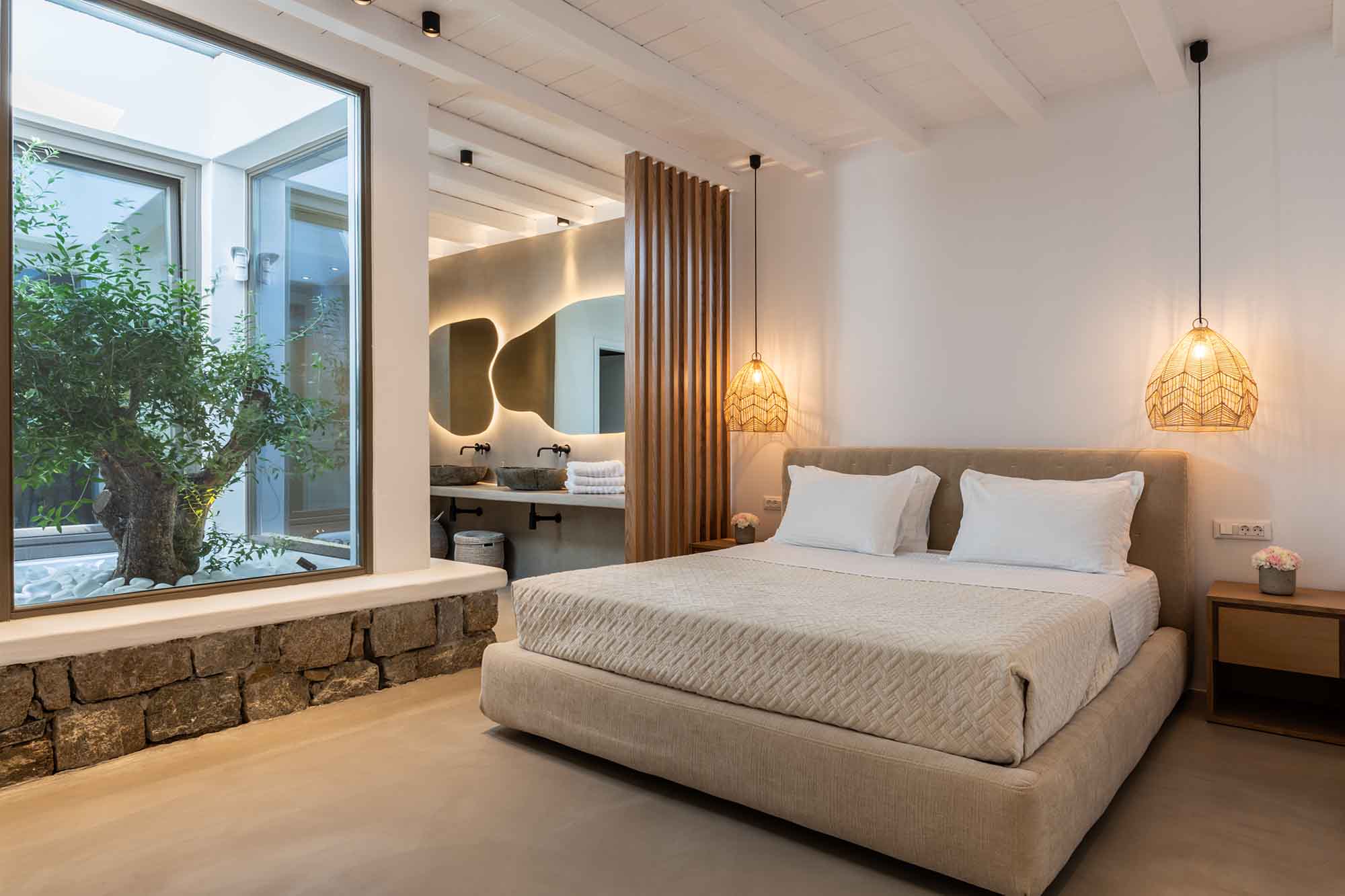 The outdoor areas are designed to appeal to guests with a variety of amenities. The private infinity swimming pool plays a central role and the alfresco jacuzzi is there to offer you relaxation moments with your loved ones. One of the highlights of the space is the pool bar, ready to serve you and your guests at the unforgettable Mykonian nights. The outdoor area includes 2 shaded dining areas, 2 shaded outdoor lounge areas and outdoor gym equipment for you to enjoy.