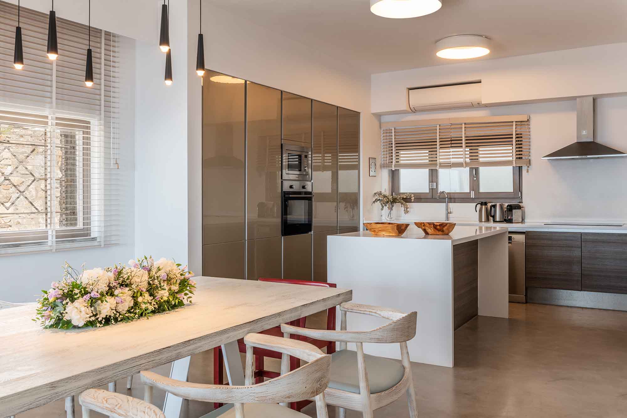 The design of the villa is modern with minimal interiors in pastel colors. The rooms are airy with elegant en suite bathrooms and art deco elements. The ground level consists of an open plan fully equipped kitchen, with a dining table and cozy lounge corners in nude tones.