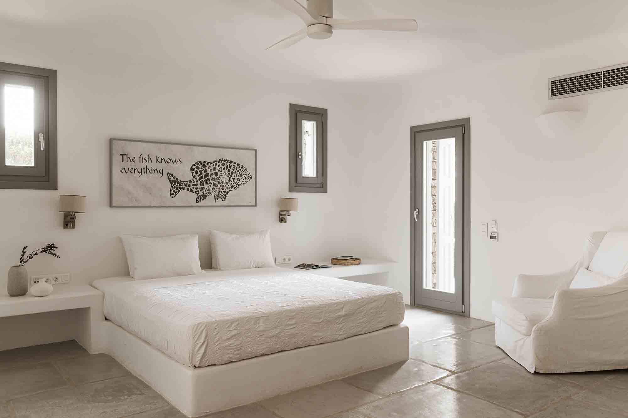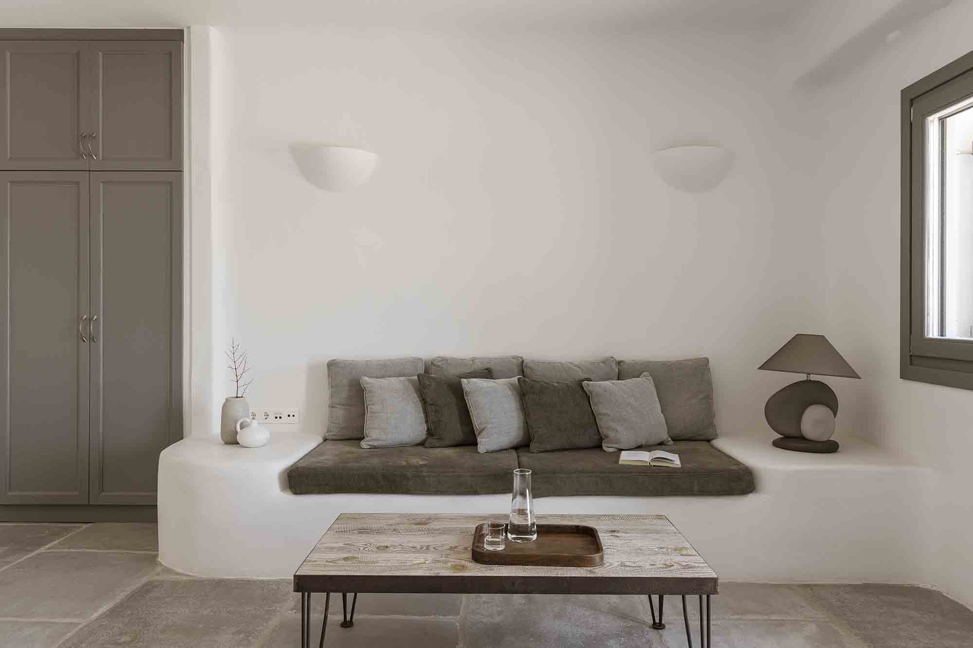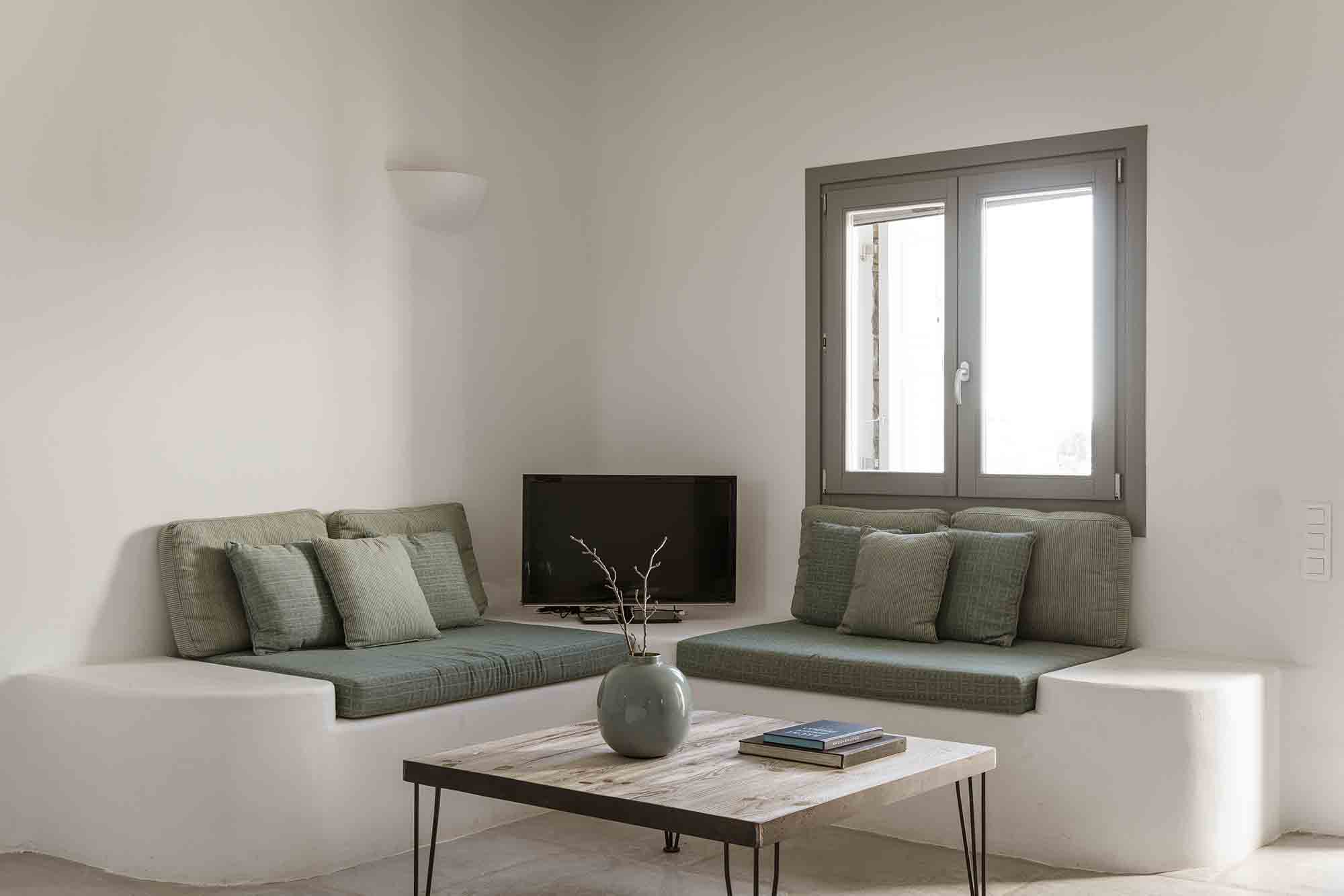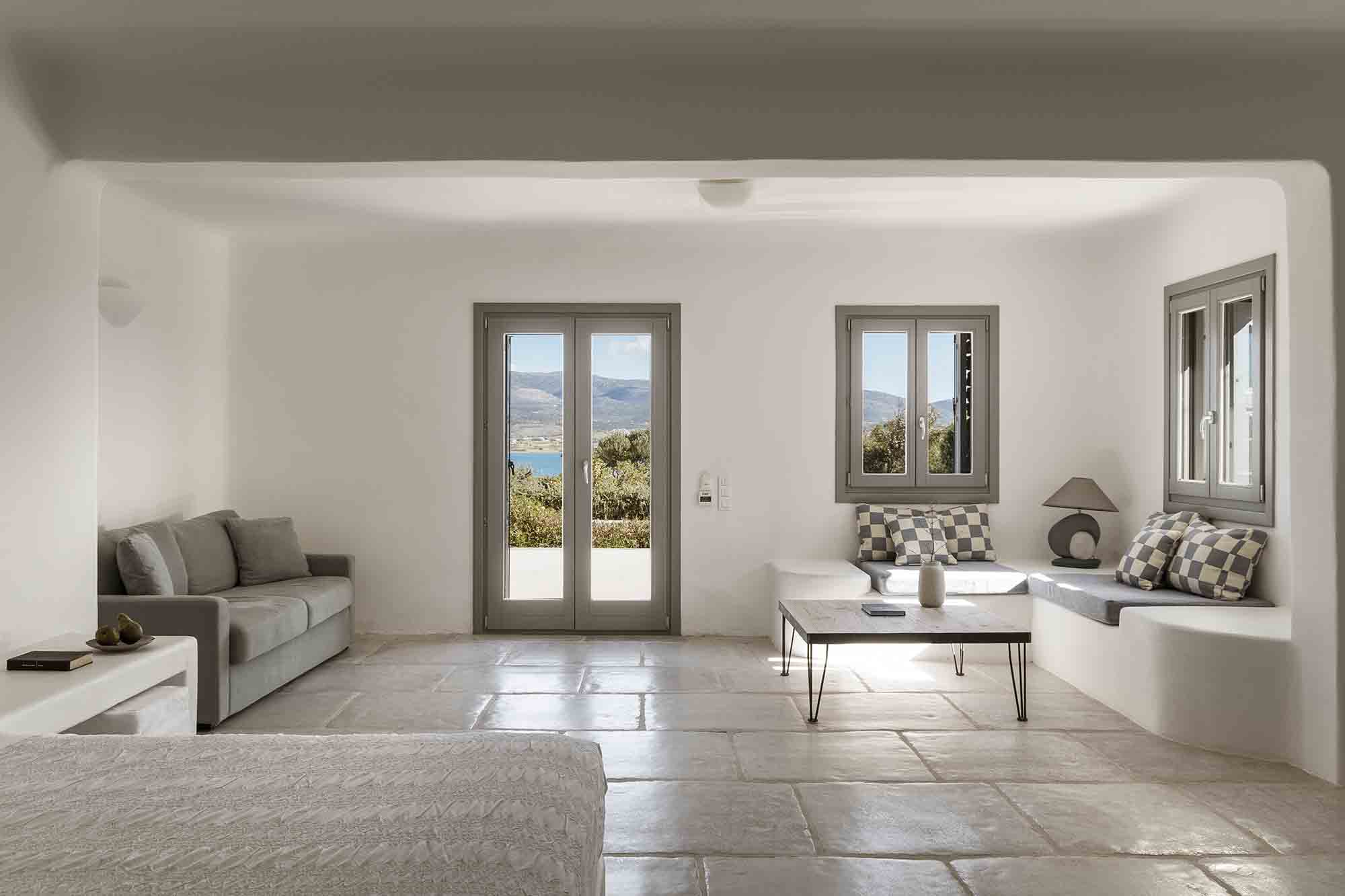 Light Cycladic design blends with ample interiors. We love the living spaces where the choice of furniture and décor enhances the home away from home ambience. Bedrooms provide great privacy while styled in expressions of white and natural colors enhancing a freshness and comfort.