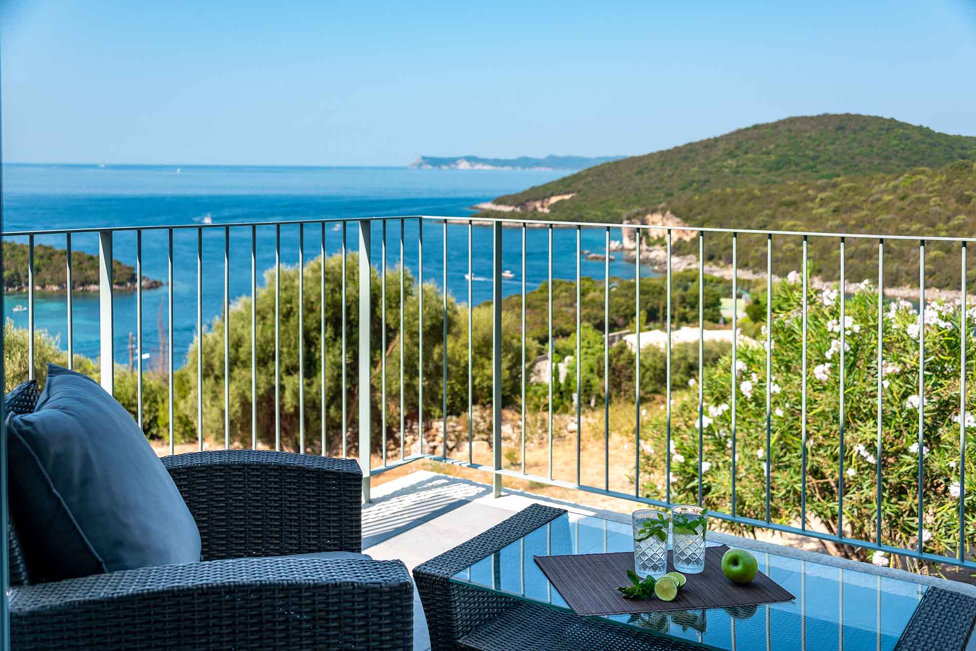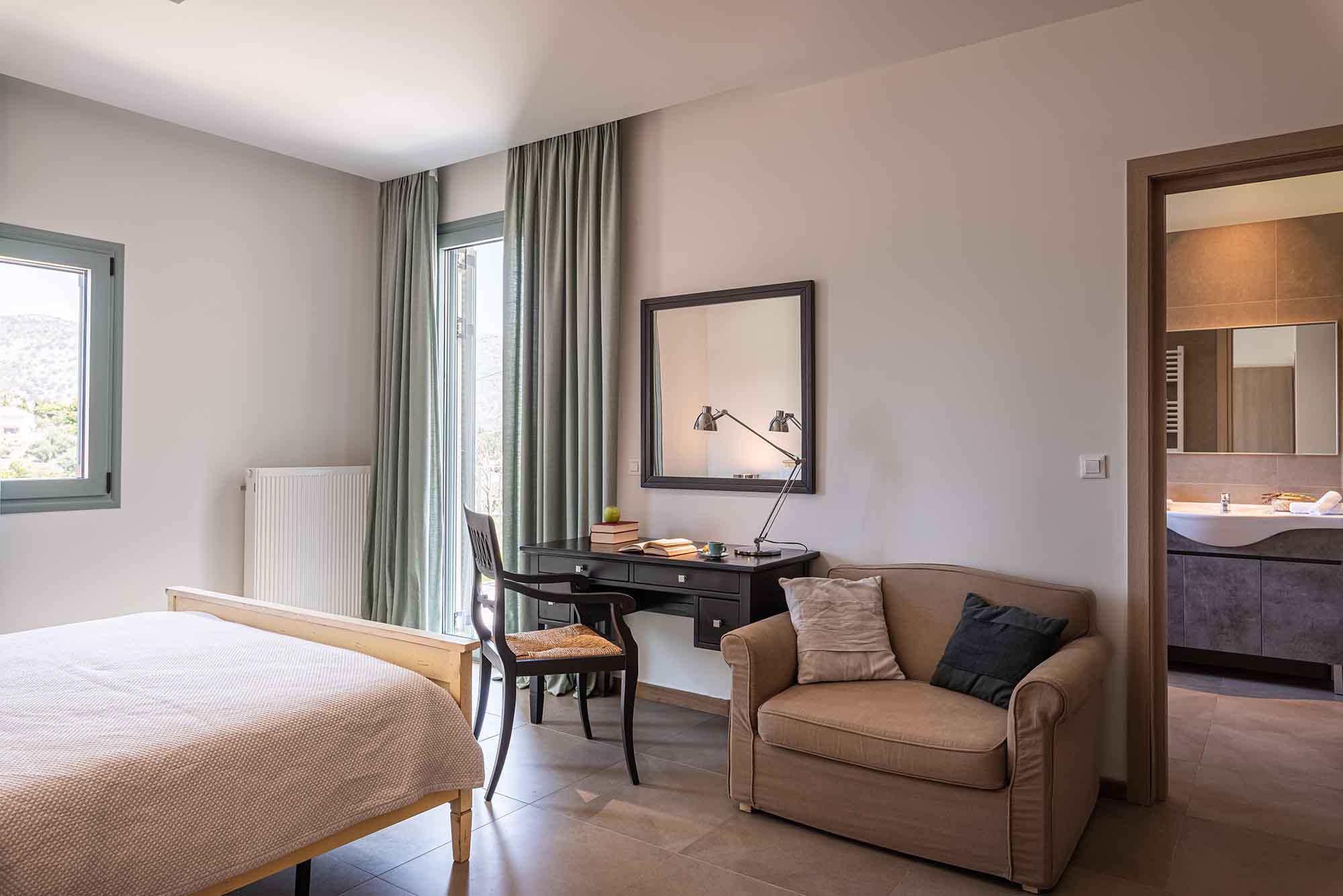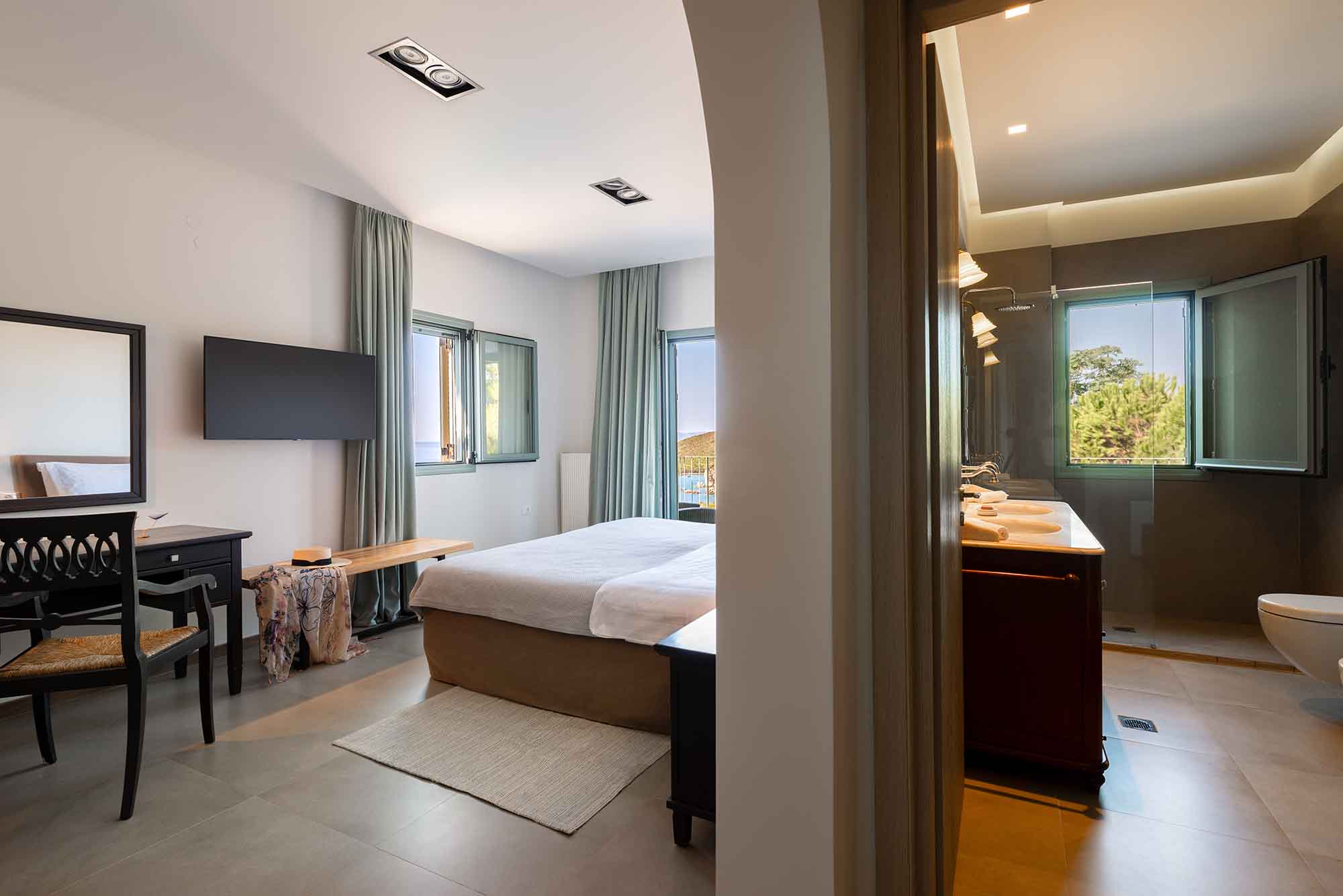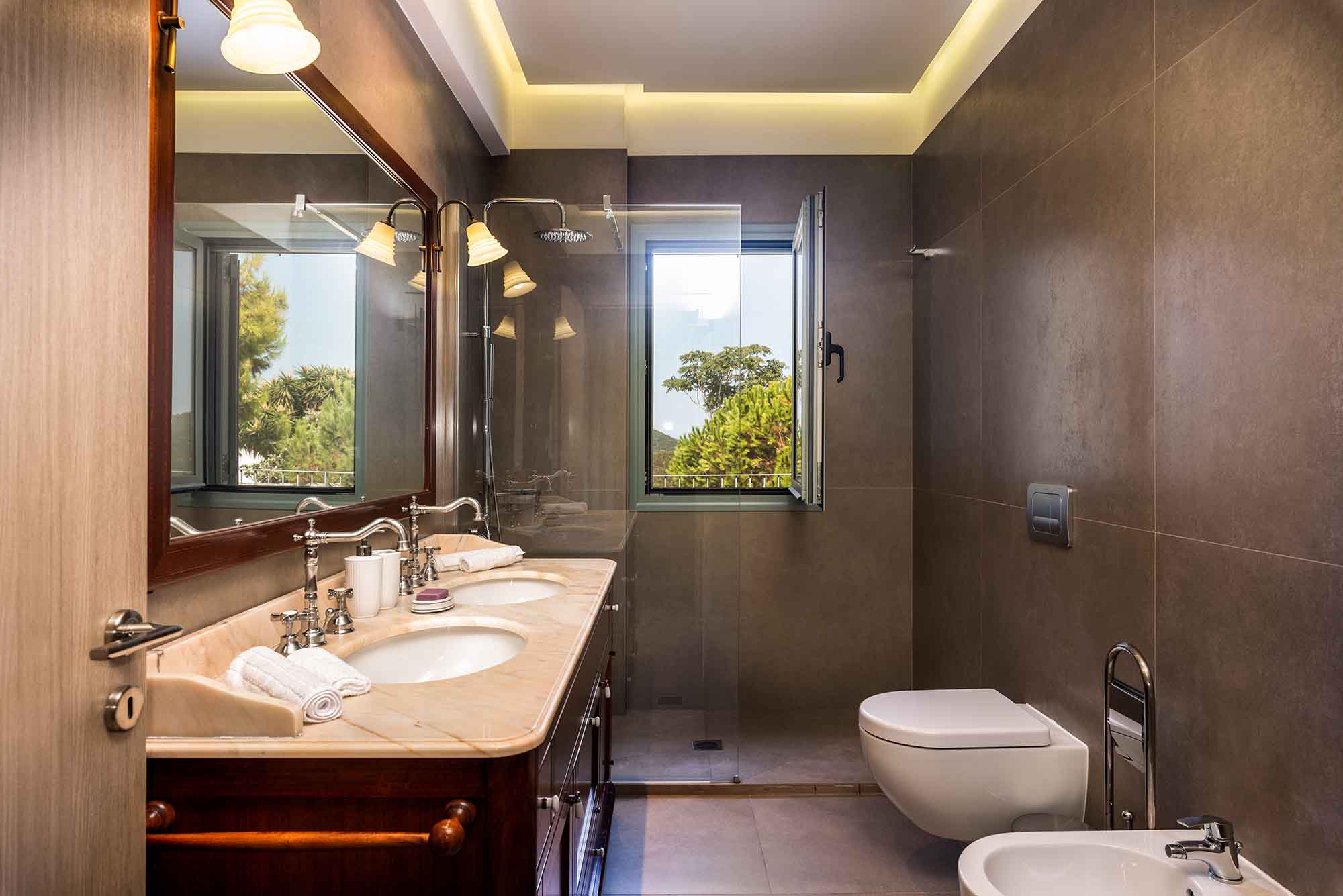 Villa Venedikty proudly hosts three lavish bedrooms, two of which are en-suite, and the third complemented by a separate, convenient bathroom. Our master bedroom opens onto an expansive balcony, perfect for soaking in the mesmerizing sea views. The second double bedroom also offers balcony access, while the third bedroom treats you with dazzling mountain views and its own balcony.