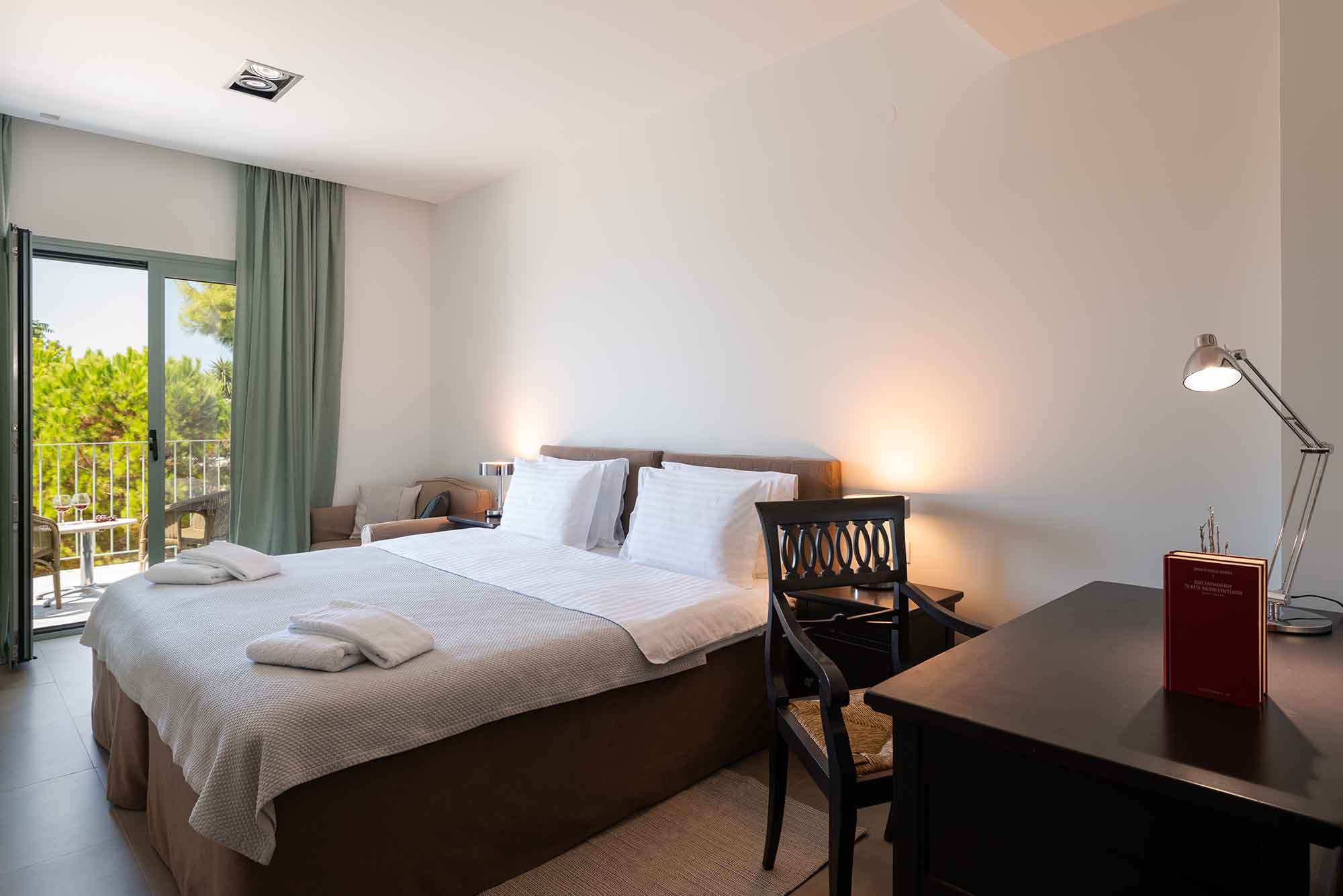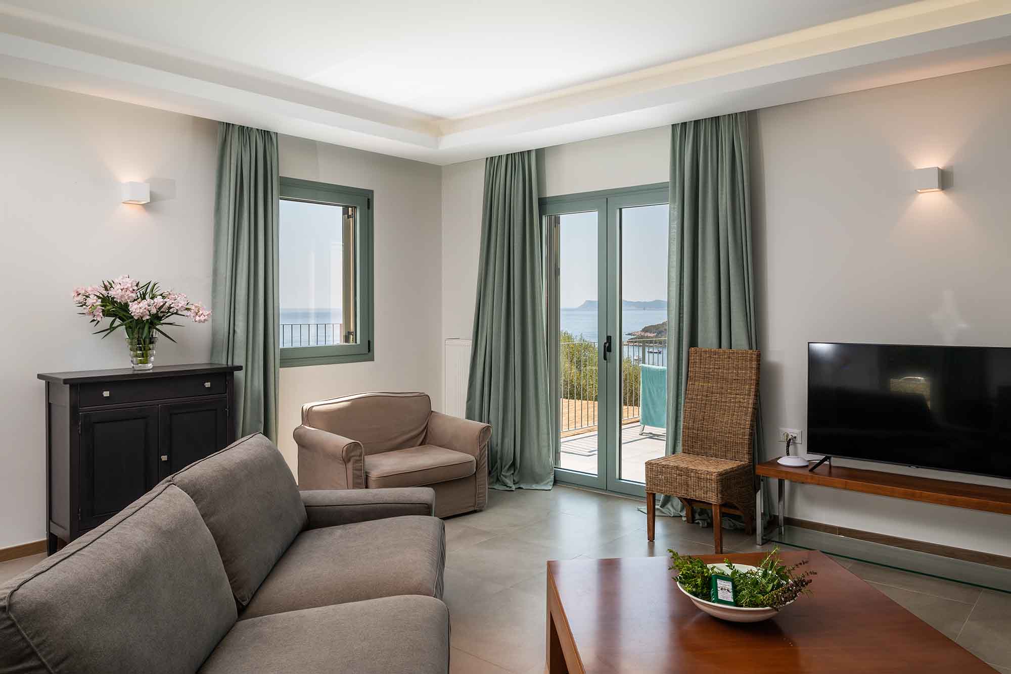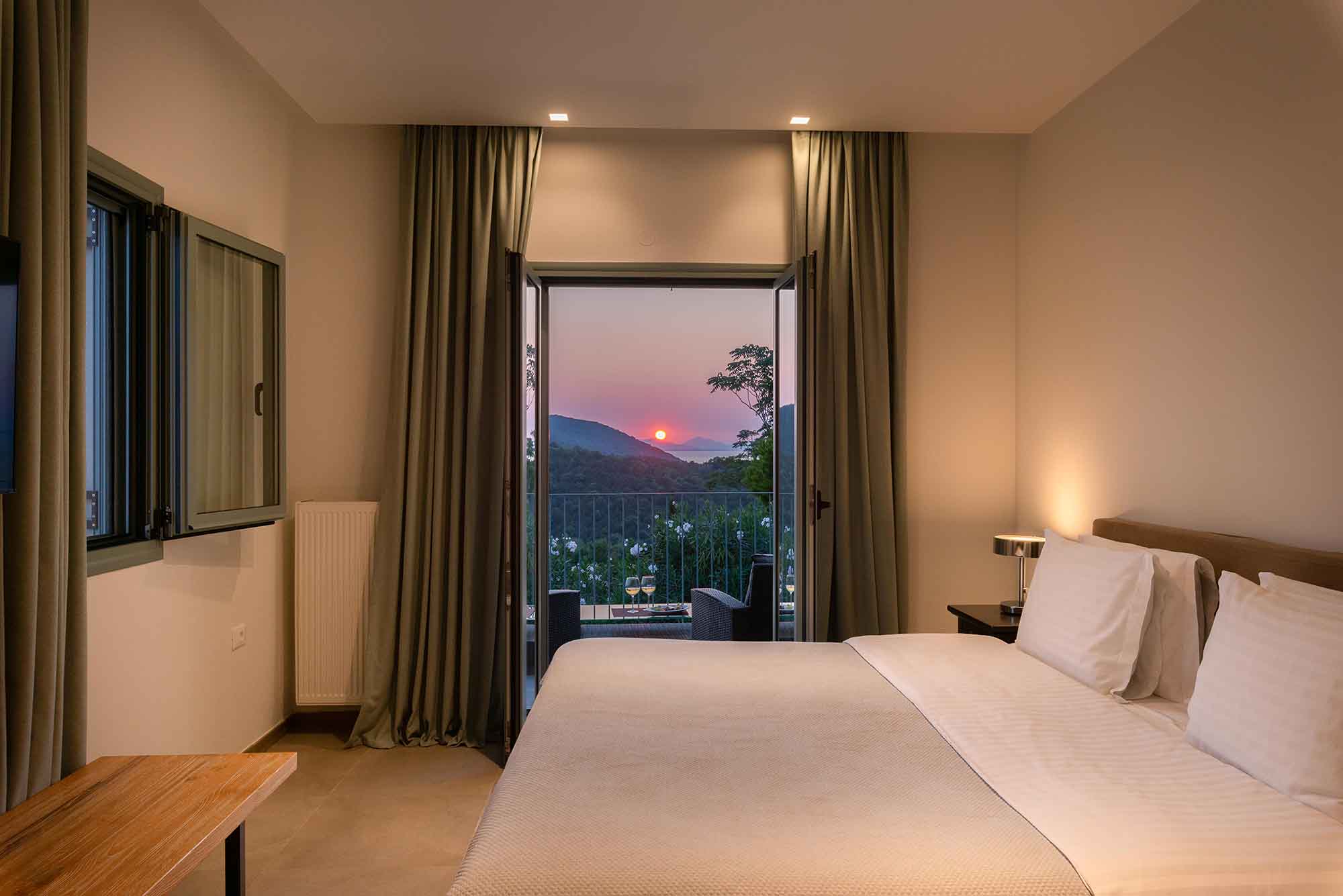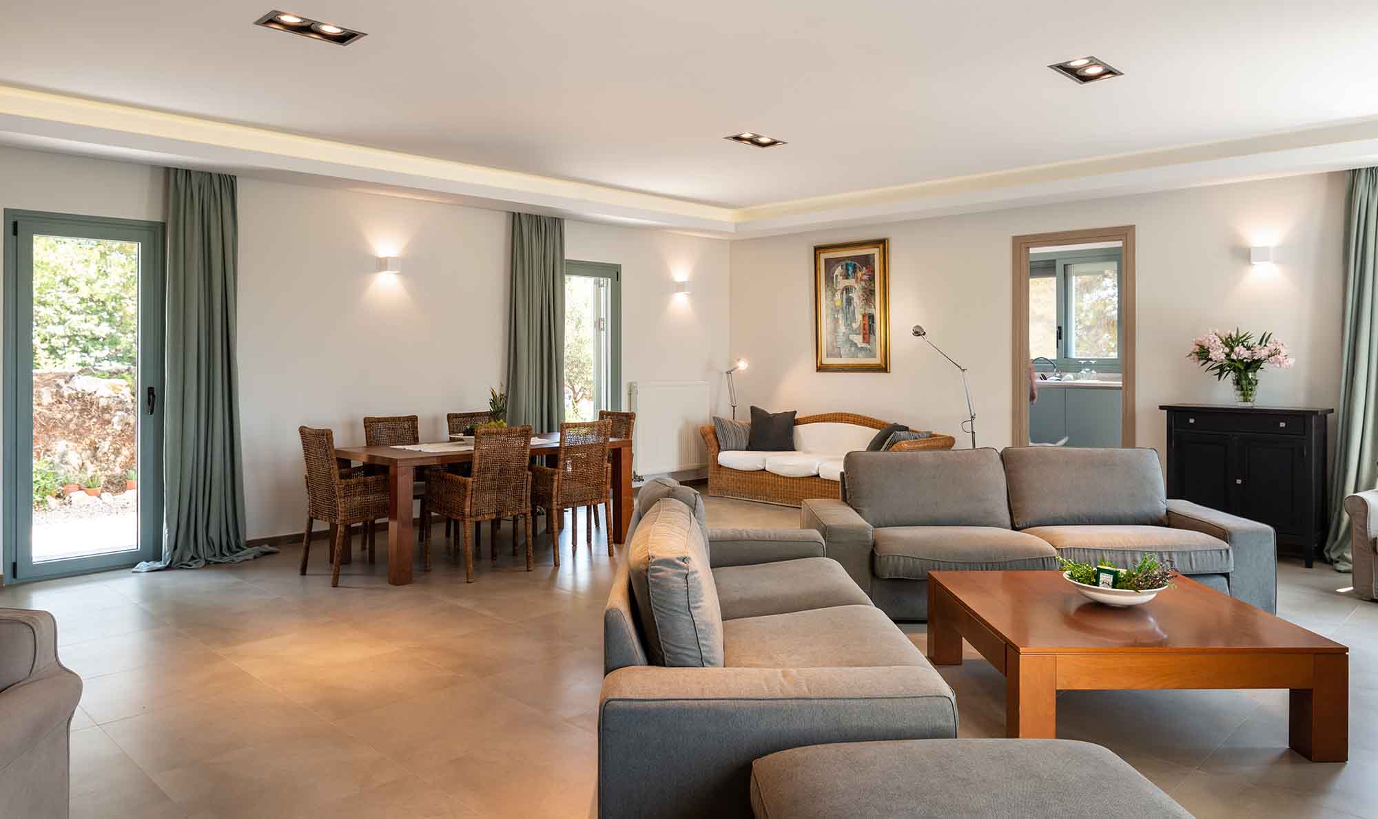 Villa Venedikty proudly hosts three lavish bedrooms, two of which are en-suite, and the third complemented by a separate, convenient bathroom. Our master bedroom opens onto an expansive balcony, perfect for soaking in the mesmerizing sea views. The second double bedroom also offers balcony access, while the third bedroom treats you with dazzling mountain views and its own balcony.