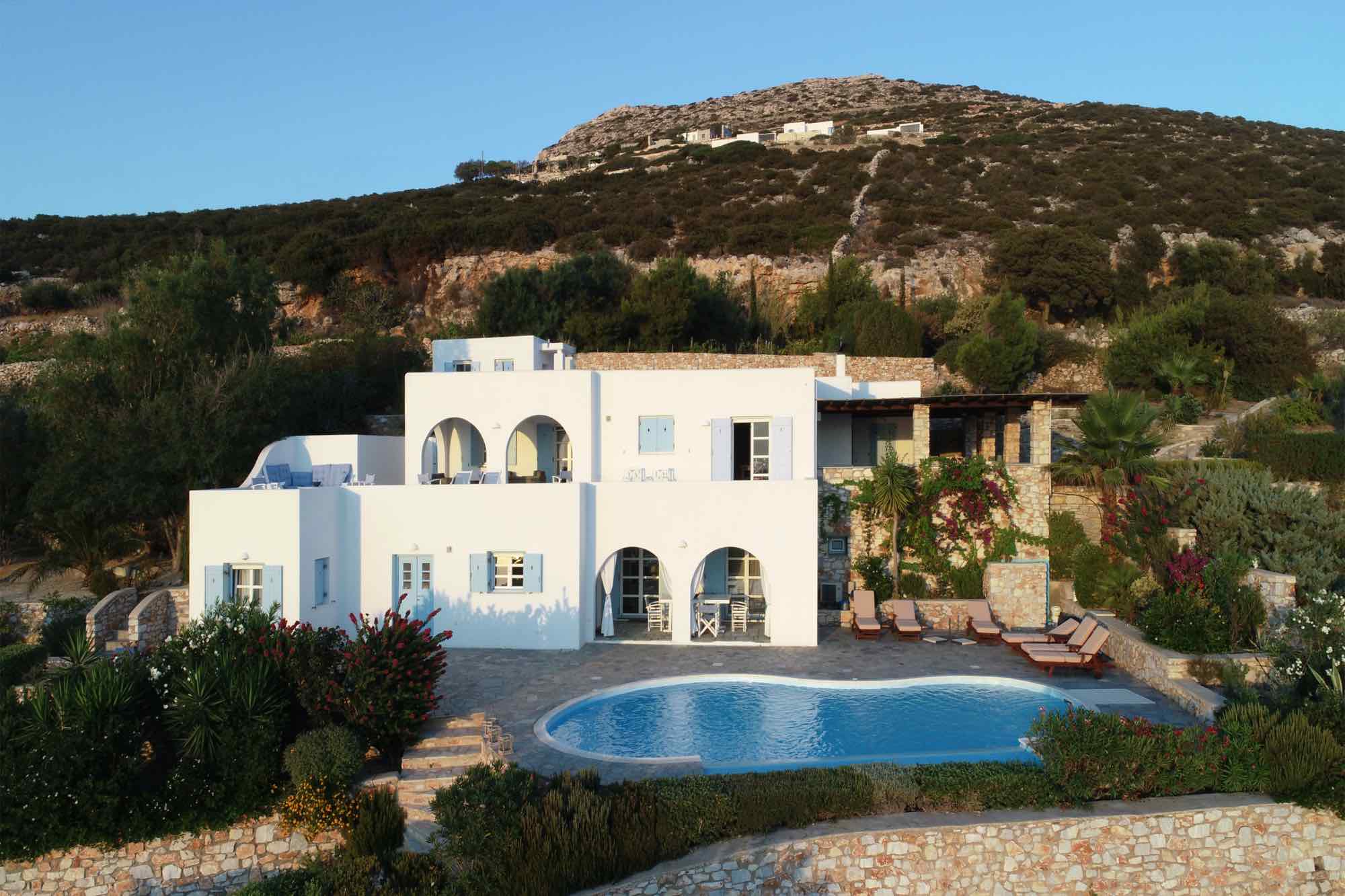 Villa Yvette, unfolds in four main volumes around the large pool, enjoying uninterrupted views of the beach and the Aegean blue. The interior is extremely refined and unpretentious while the choice of fabrics and furniture creates an aristocratic yet comfortable ambience, enhanced by a careful selection of artwork and paintings. The center piece in the main living space is the dining table, a 300-year-old table from a French monastery. The villas offer four spacious double bedrooms, each decorated differently and uniquely.